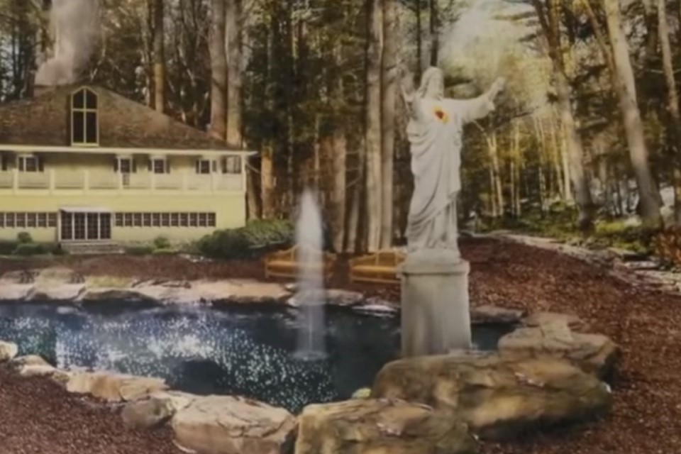 At the base of a magnificent waterfall sits the Chasuble Studio-Chapel. The grounds also feature religious works of art highlighted by the Holiness Trail - the Stations of The Cross set in the natural beauty of the local area's trees and foliage.